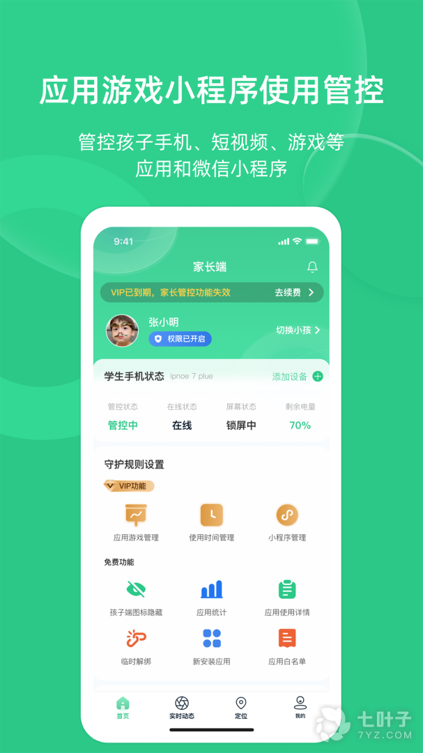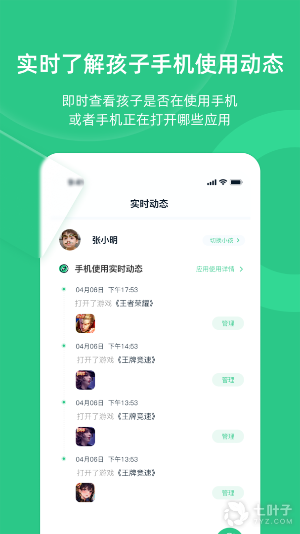 2、家长端可以实时查看孩子手机使用动态,应用、游戏今日使用的时长