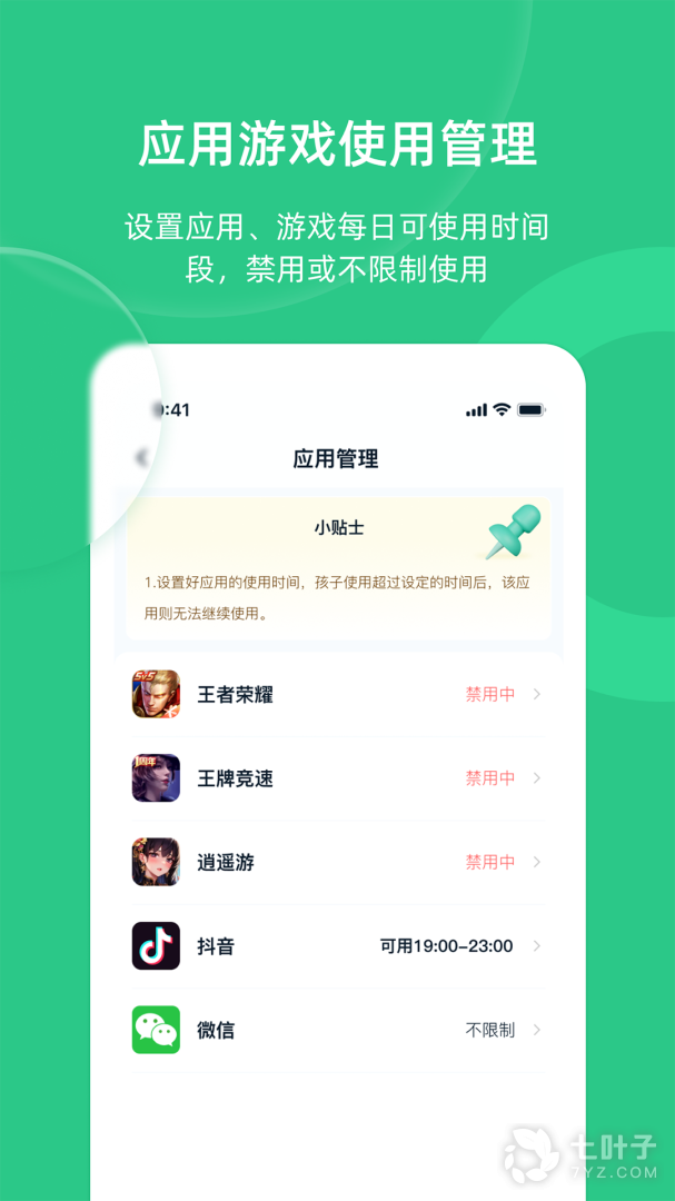 3、游戏、应用禁用管理:可远程控制对单个应用,游戏进行禁用、可用时间段等管理,例如设置8:00-20:00可用,在这个时间内可以正常使用,超出时间后应用闪退退出当前软件,无法打开,引导孩子合理健康使用手机