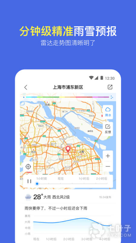 1、实况天气预报APP为用户展示24小时的天气检测,每个小时的天气都精准预测,还有短时间内的降雨提醒,梅雨季也不要担心了