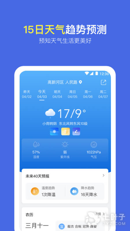 4、全面的天气指数:温度、天气状况、风向、湿度、空气质量、穿衣指数、感冒指数、15日预报……