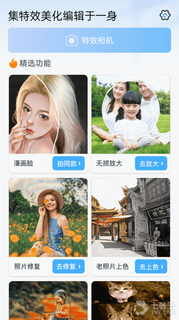 2、百变特效相机,变老时光机,看看30年后的自己;童颜相机,带你会议小时候的自己;一键换背景,智能抠图便捷更换背景;漫画特效,一键生成艺术照