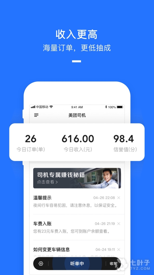 3、这款美团打车司机APP为各位用户们提供了一个线上打车出行的接单平台,海量的出行订单可以获取,为网约车司机们提供优质的接单办公服务。通过手机定位来锁定自己所在城市,系统自动为用户们提供订单资源,一键接取,查看详细的出行信息,AI语音全程提供安全导航服务,将乘客安全的送到目的地
