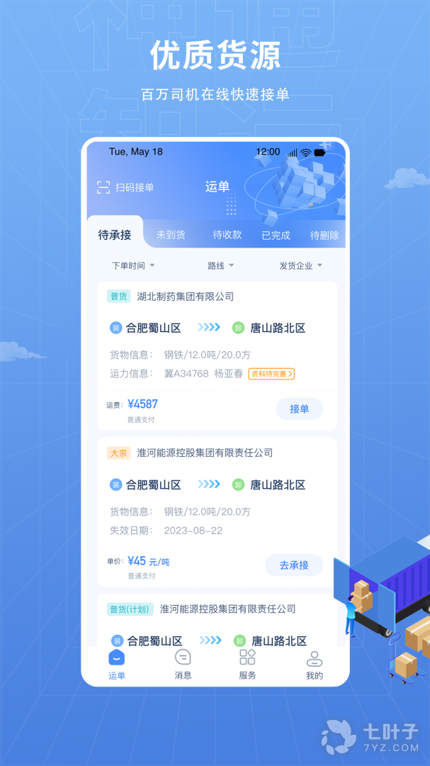 4、货源大厅模块,司机可根据自身情况承接平台内所有企业运单,为司机提供更多货源;