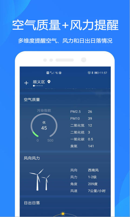 2、丰富天气信息:实时天气数据、未来24小时天气预报、15日天气预报、空气质量指数、空气污染指数、pm2.5、风力、温度、湿度、日出日落、气压、能见度。