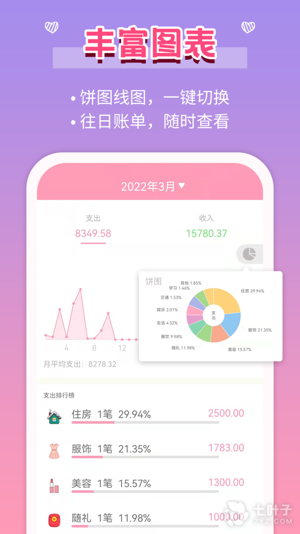 3、贴心统计数据的功能,清晰的文字图表展示,丢掉随身的计算机,轻松掌握各账务