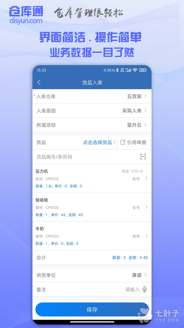 3、仓库通最新版是非常不错的仓库管理软件,能够很好的管理商品的进销存,对商品进行上架、下架、盘点、退回等等多种操作,实时备份数据,不用担心数据泄露或遗失,让大家管理库存更加简单方便