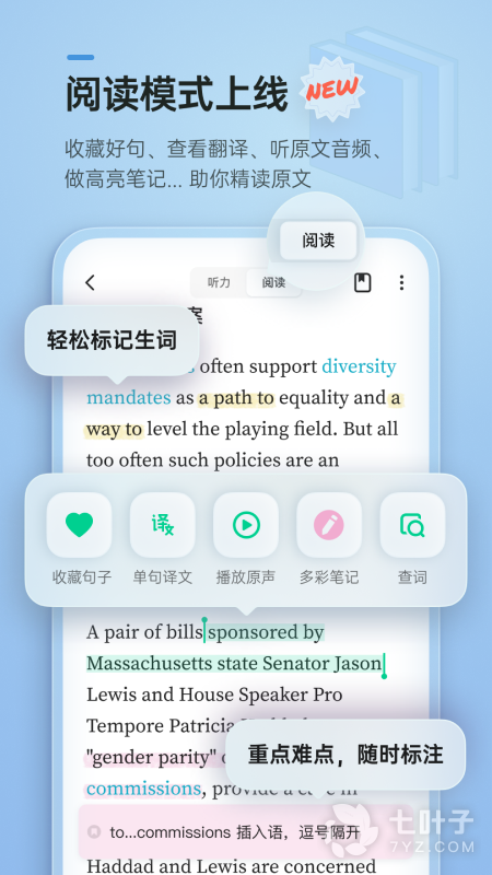 1、在课文中长按单词查询释义,加为生词后在所有文章中高亮显示,生词本可同步至不背单词学习
