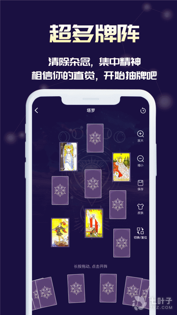 2、提供最专业的塔罗牌测试,不同的牌阵应对不用的问题,线上开启测试模式,78张塔罗牌,帮你解答心中疑惑,预测桃花、事业运势
