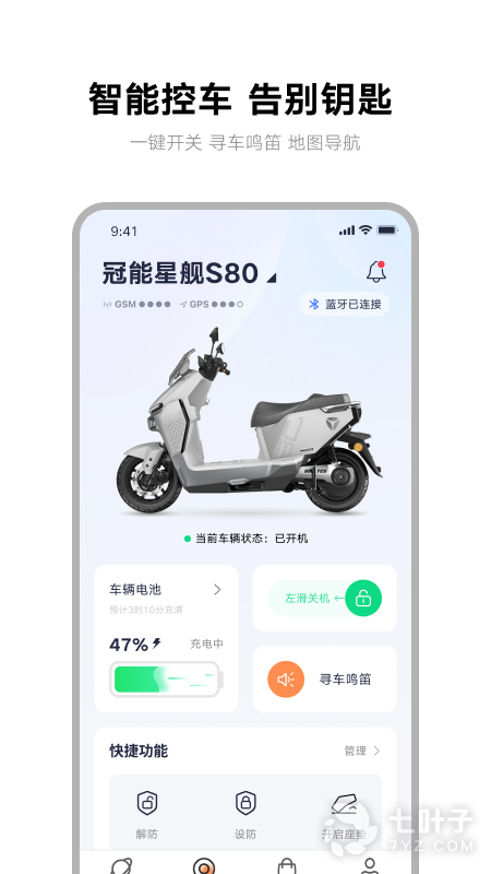 雅迪智行,您的电动车安心管家;支持远程启车、锁车、报警鸣笛、导航寻车。