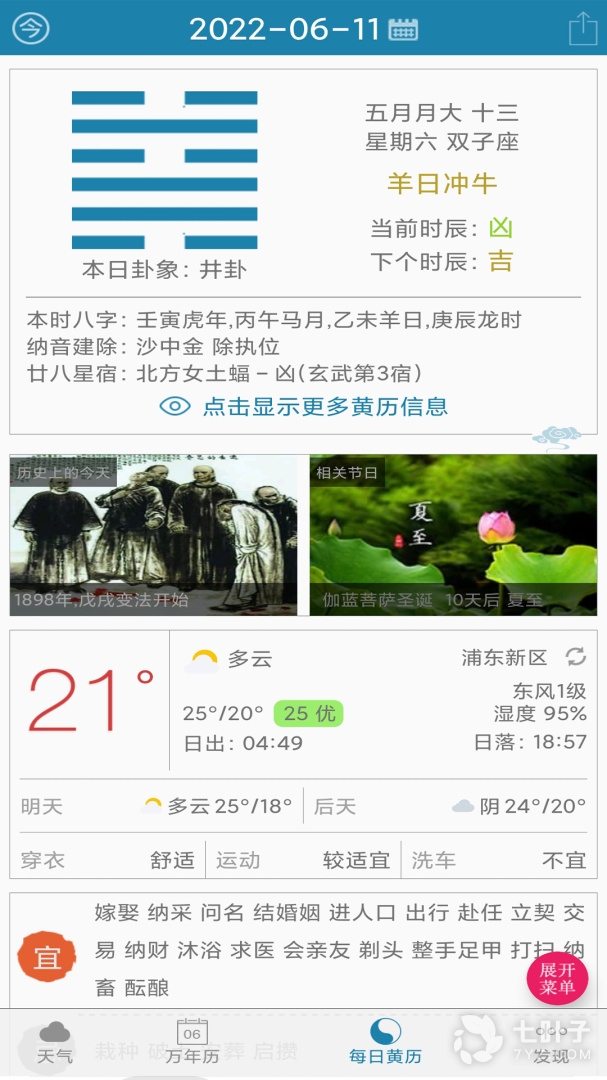 2、软件拥有黄历卦象,万年历,五行八字,天气,周公解梦,历史上的今天等诸多功能