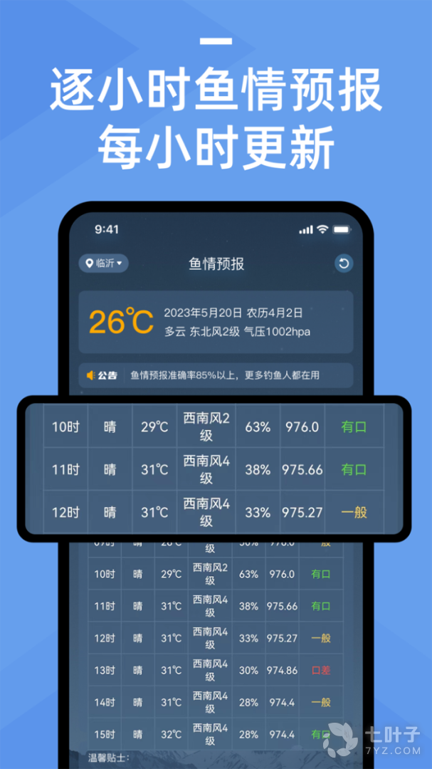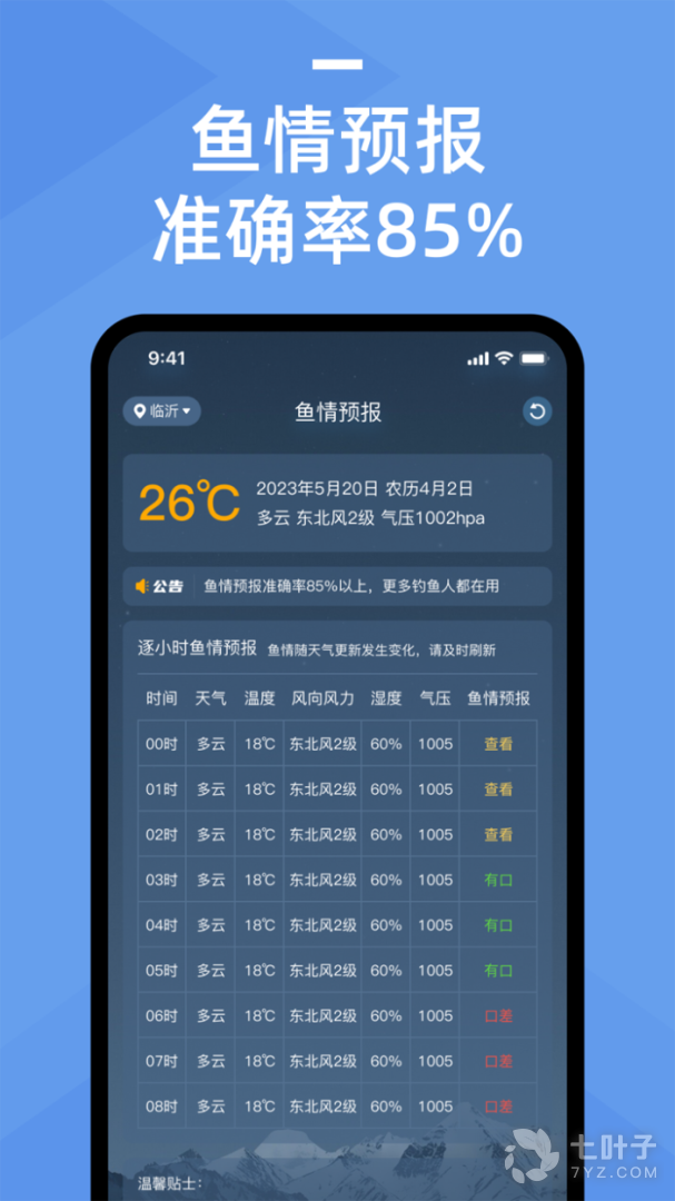 2、鱼情预报是临沂鱼情预报科技服务有限公司为广大钓鱼爱好者打造的鱼情软件。用户通过软件就能了解附近的钓鱼地点,软件还会根据天气变化来分析是否合适钓鱼。软件内的数据实时更新,让用户及时了解,还有超长的7天鱼情预报,让用户可以提前做好出门钓鱼的准备