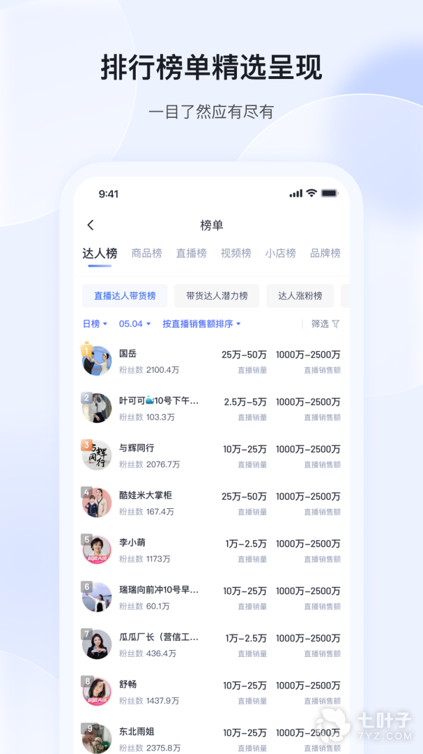 1、通过该软件用户可以轻松的了解到热销榜单、优质达人、商品数据等信息,然后可以根据这些信息来进行学习,让自己拍摄的短视频可以更快的具有流量,极大的促进的用户对行业数据的分析效率