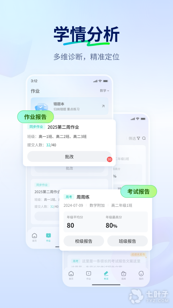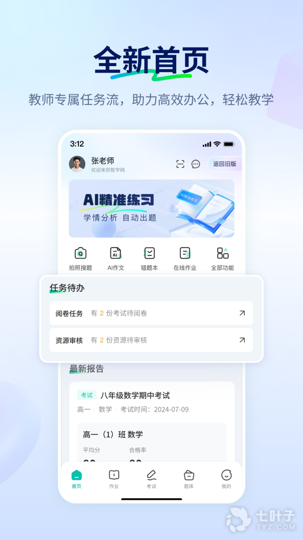 2、智学教师端,教师专用的教学服务平台,智能化分析教学数据,一目了然,帮助教师及时掌握教学情况。软件还拥有试卷讲评、微课录制、报告生成等多种功能,让教学更便捷