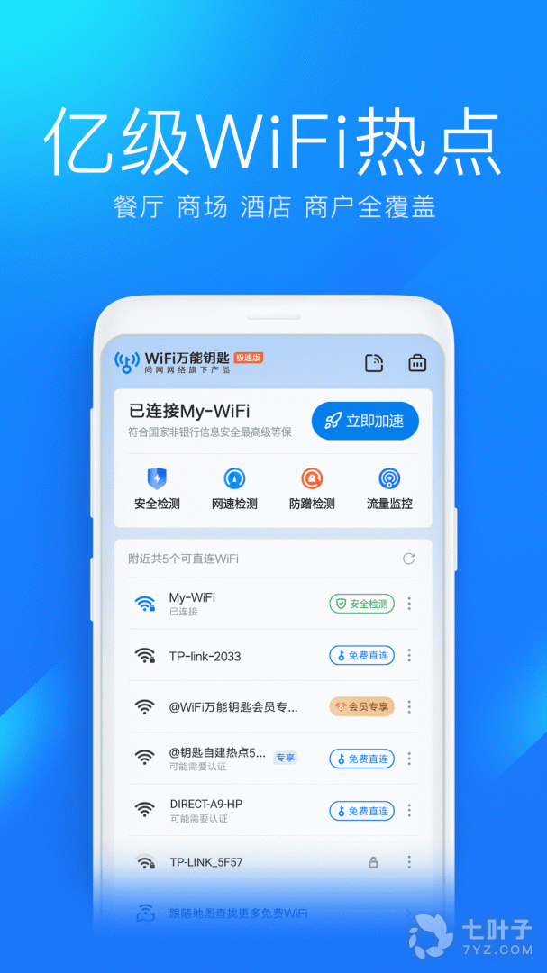 4、wifi万能钥匙是由连尚网络官方推出的wifi万能钥匙app的本,相比较优势在于软件非常小巧,不占内存,运行启动快,极速连接附近wifi,网络稳定,节省流量