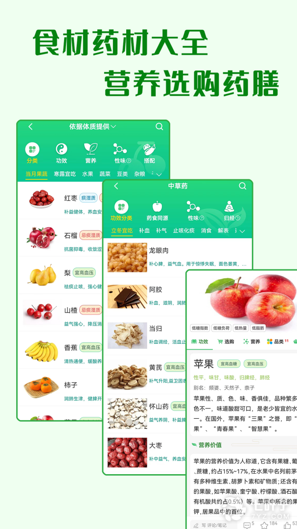 列出了260余种食物的功效、宜忌、搭配、营养成份及相关食谱,可按营养、功效、性味归经分类;