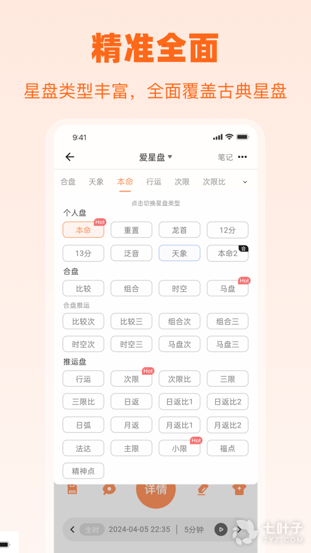 1、全面的星盘类型支持,包括本命盘、合盘(比较盘、配对盘、组合中点盘、时空中点盘、马克思盘)、推运盘(行运盘、次限盘、推进盘、三限盘、太阳返照盘、月亮返照盘、太阳弧盘、法达星限)、合盘推运(组合次/三限盘、时空次/三限盘、马盘次/三限盘),基本囊括你所了解到的全部星盘类型;