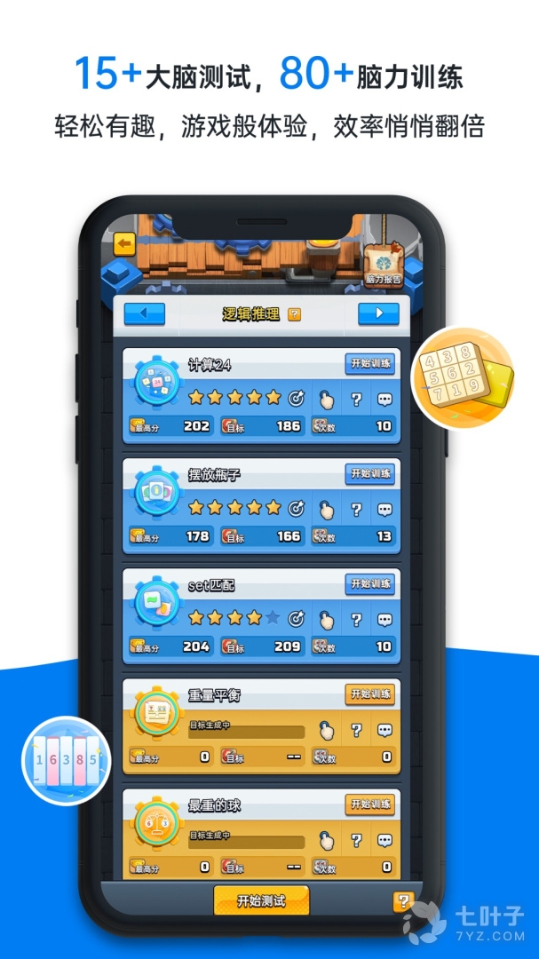 1、手游中拥有近80个训练项目,可以有效训练包括视知觉、听知觉、注意力、记忆力、逻辑推理、言语理解、工作记忆等