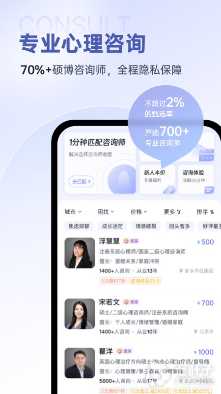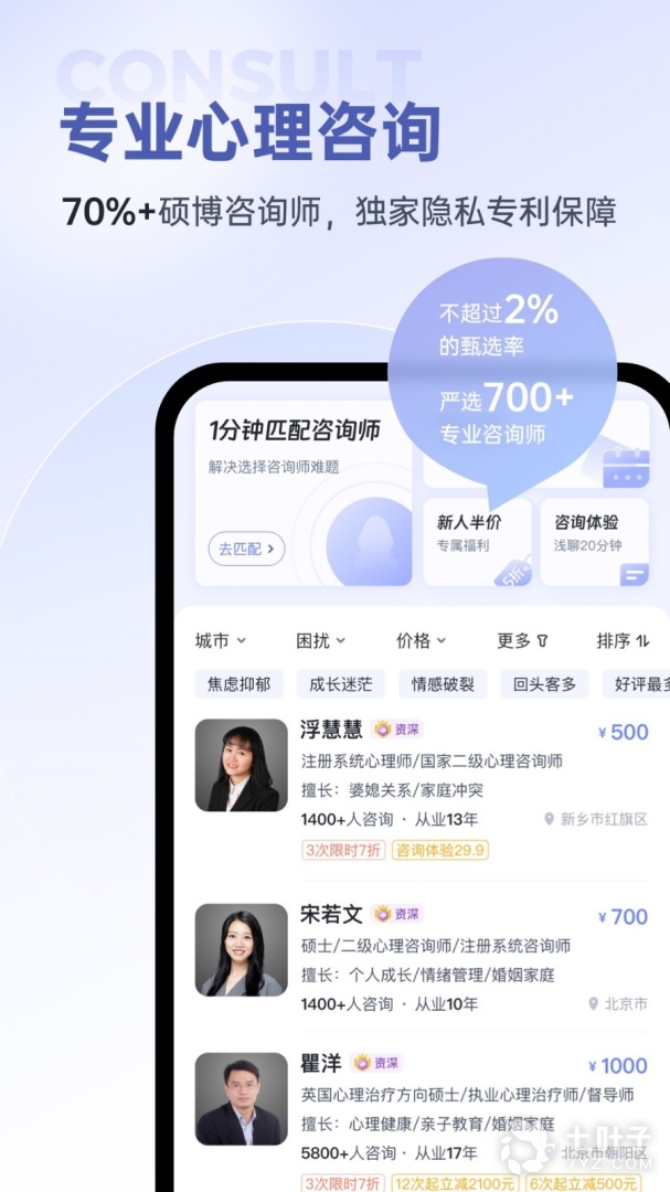 樊富珉、赵旭东等知名大咖领衔,壹心理咨询专家委员会正式成立!想找靠谱的心理咨询服务?专业评审团队优中选优,以低于 2% 的认证通过率严选 600 多名专业咨询师。来壹心理,找到优质、靠谱的心理咨询服务。