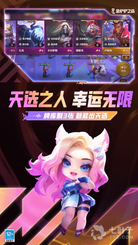 《金铲铲之战》是英雄联盟云顶之弈正版授权的自动战斗品类手游,每局比赛由八名玩家共同进行一场各自为战的博弈对抗,玩家通过招兵买马、融合英雄、提升战力、排兵布阵,最终成为立于战场上的赢家。