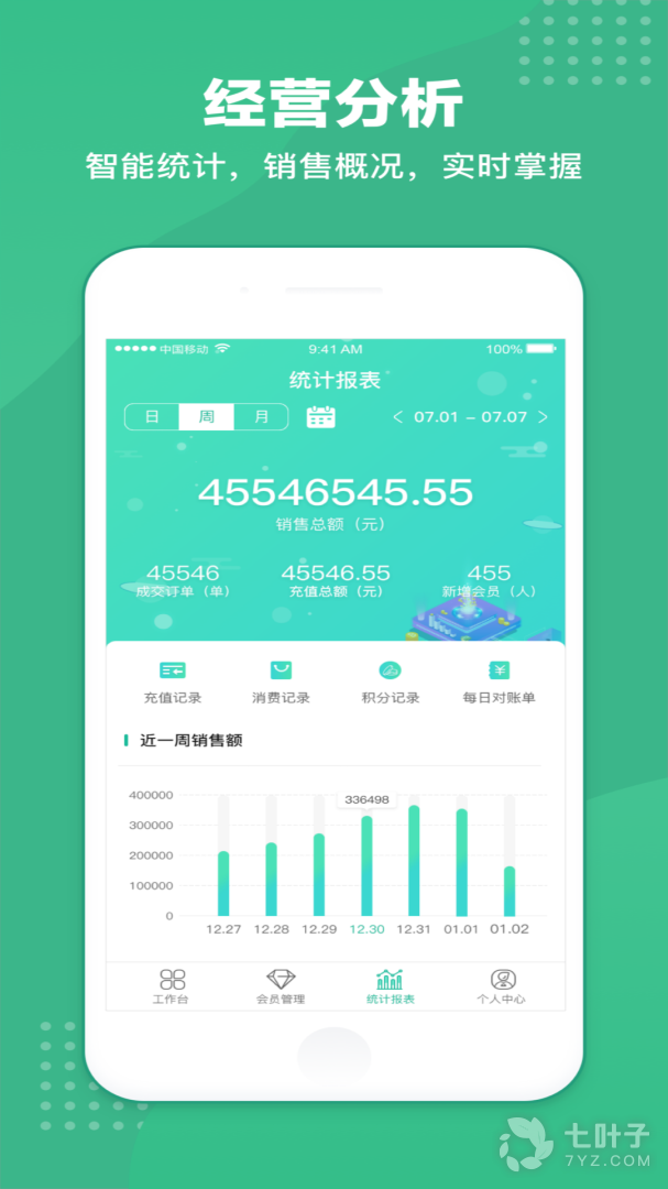 5、“统计报表”功能则能随时查看每周、每月、每天的数据,非常实用。