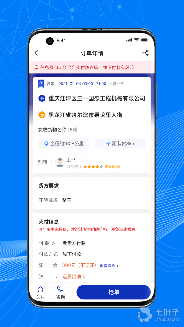 2、顺风大运车主是为大件运输服务的货运司机开发的接单平台,在这里有着稳定的订单资源,几乎每日都有货主在这里共享新订单,让广大货运司机通过报价抢单的方式获取新订单;服务范围非常广,超多城市地区的货源订单都有,直接输入常跑路线,系统就会根据用户的需求智能匹配,推送常跑路线货源;使用顺风大运车主,提供的是开放式注册服务,车主在接单前,只需要在这里进行身份认证和车辆认证,然后就能线上接单了;摒弃传统低效、成本高的接单模式,在这里灵活接单,让你每天都有新订单,每天都能赚钱
