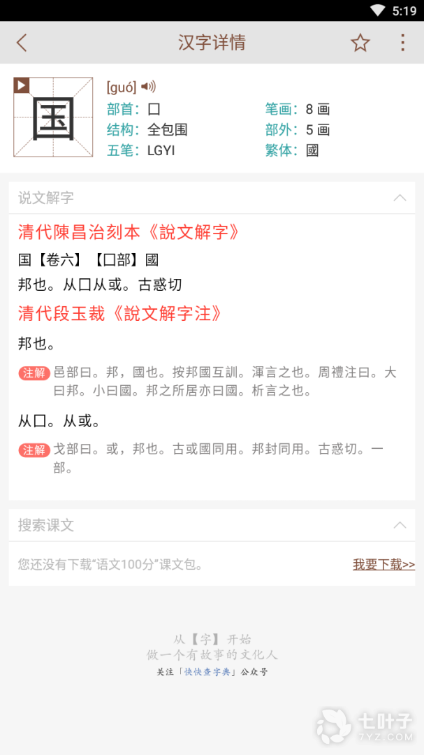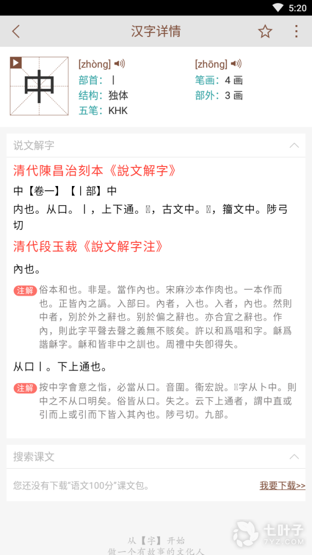 2、文字下方是清代陈昌治刻本说文解字的文字注释原文,软件加入了现代译文,一举两得