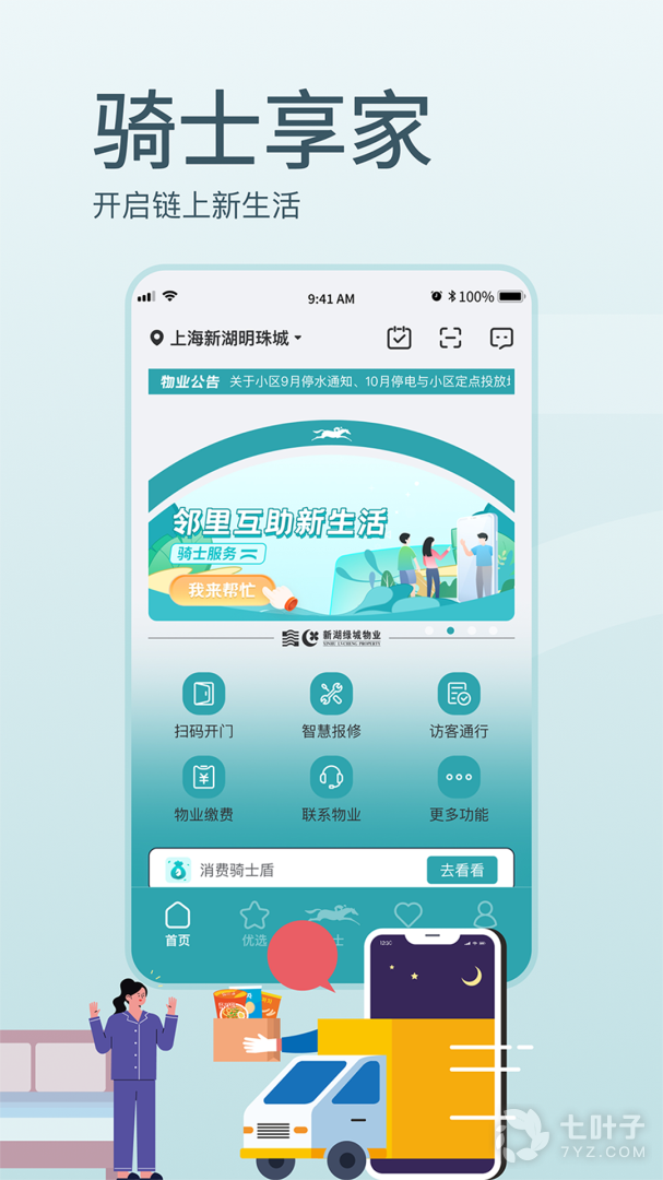 骑士享家是一款智慧社区服务平台,平台拥有扫码开门,智慧报修,超值优选,访客通行等等功能服务,需要的朋友可以前来下载使用。