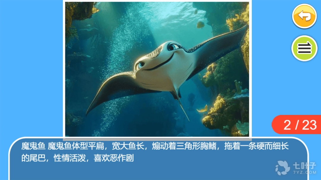 1、提供了丰富多样的海洋生物照片,在满足孩子好奇心的同时也学习到了各种海洋生物知识。软件还准备了拼图游戏、找不同等有趣的小游戏来加深孩子的记忆,让孩子能够牢牢的记住这些知识
