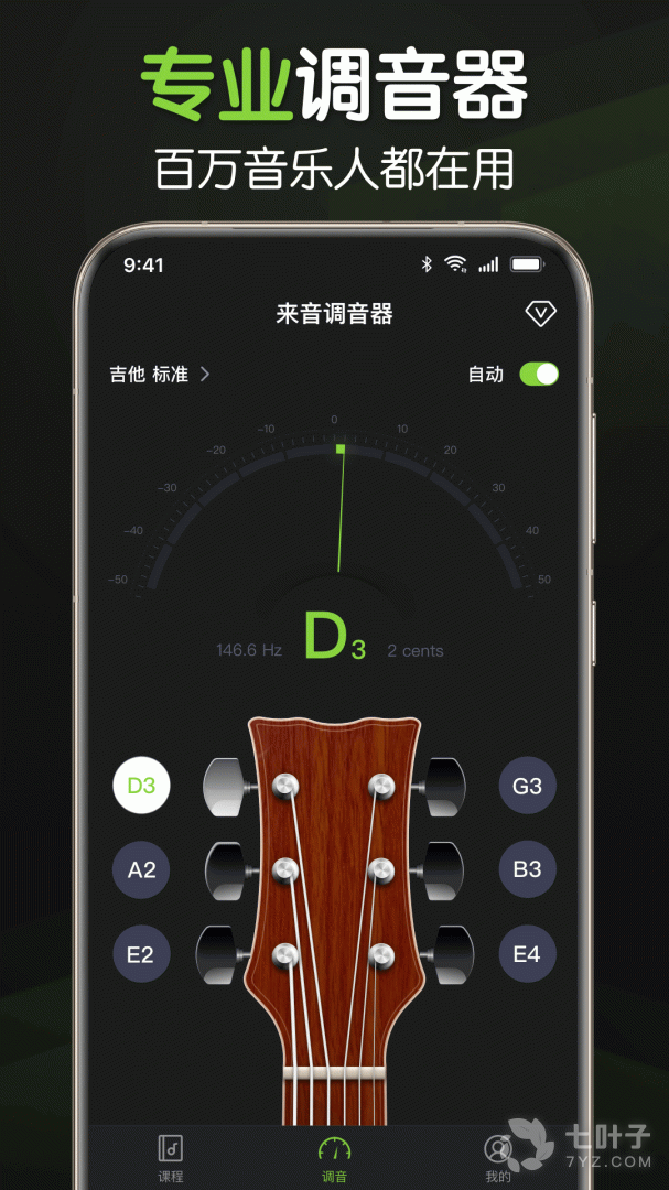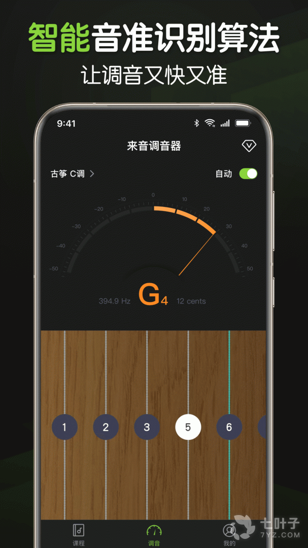 1、来音调音器,一款支持吉他、古筝、古琴、尤克里里、小提琴等多种乐器的手机调音工具,使用简单,选择对应乐器,在线调音,精准识别音乐,让乐器调音更轻松