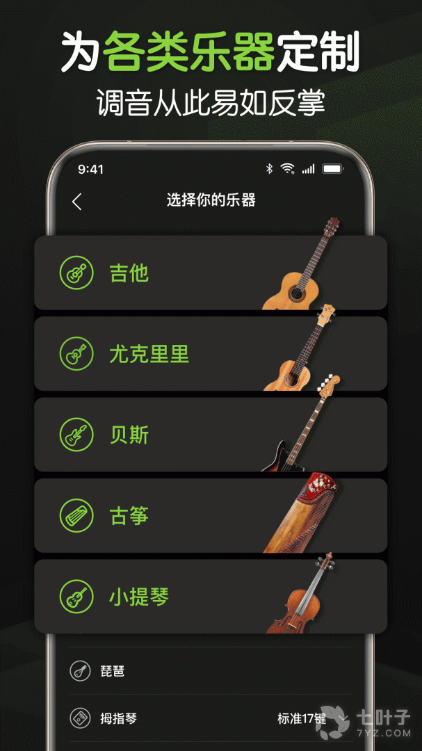 3、除了吉他,来音调音器还支持各种不同乐器调音,智能调音,用和弦游戏检测,精准详细,是一款非常实用的软件