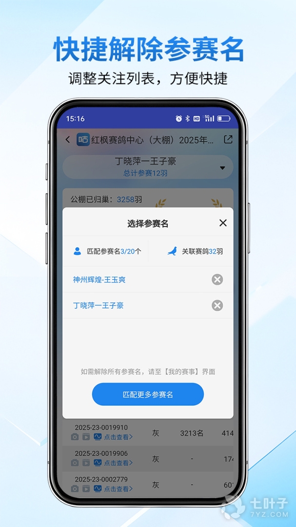 4、便捷的搜索功能可根据足环号,参赛名,会员编号查询成绩