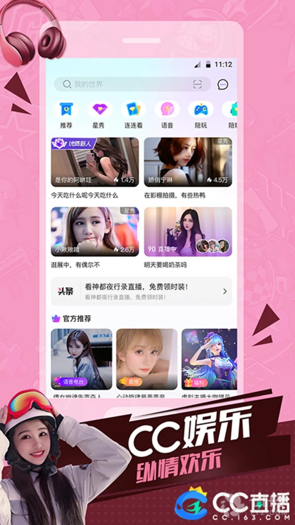 1、世界那么大,无论你我有多远距离,相隔多少时差,当你身边有惊喜、有趣、快乐的事情发生,都可以拿起手机,打开CC,进行实时直播!健身、户外、猎奇、美食、搞笑、二次元.......cc直播内容多元化需要你的加入!期待每一个与众不同的你,签约cc直播,走上人生巅峰,绝不是套路~