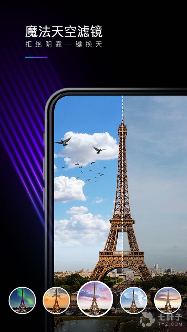 1.更换背景图:打开app,点击图片编辑模式,就可以选择你需要的星空图片,白天也可以拍出夜晚的星空;