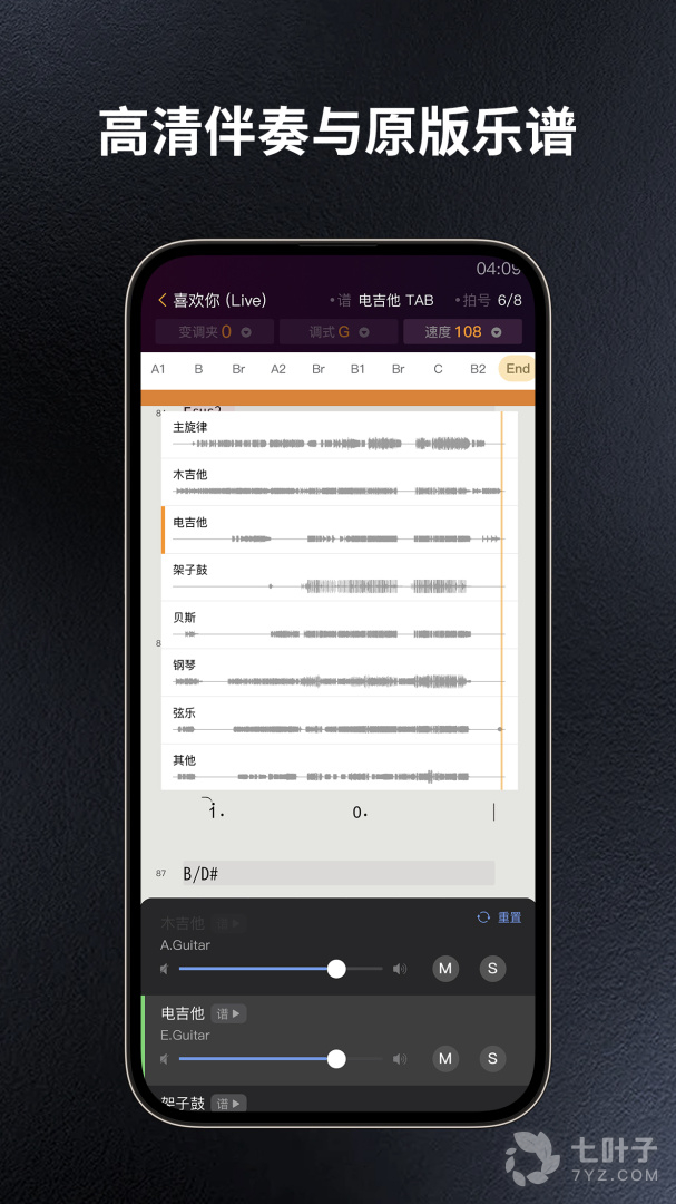5、同时,板凳音乐支持吉他、鼓、键盘和钢琴四种主流乐器的线性乐谱显示