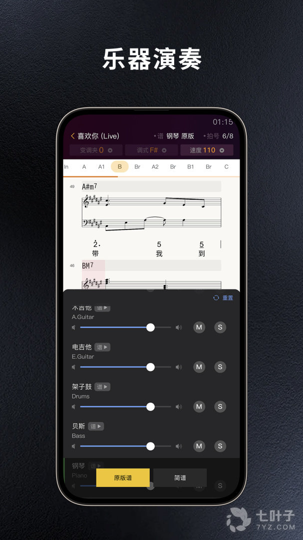 2、每首歌曲实时切换,不同乐器演奏乐谱