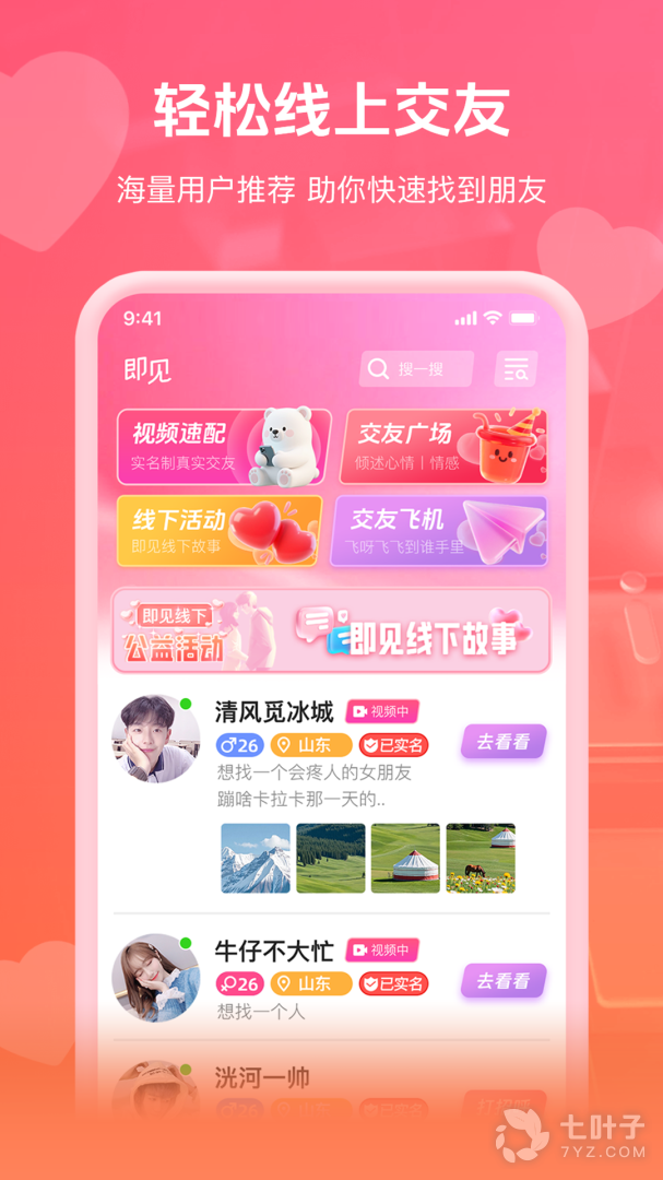 即见是一款集相亲,交友,社交于一身的APP。以视频,语音,文字等多种方式,多场景的为用户创造更多的缘分,打造360度恋爱圈!万人会员专程为爱而来,每天百余人成功牵手。神准的爱情测试,助你找到适合自己的恋人。不信来测