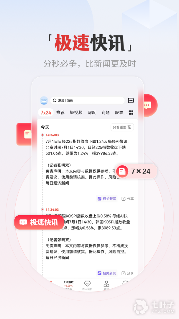 6、资讯数据快速全面聚焦国内外财经资讯、数据,更新及时,推送迅速。行情、自选股等功能链接全球金融市场,7*24小时传递干货数据,助您及时调整投资决策,完成财富积累