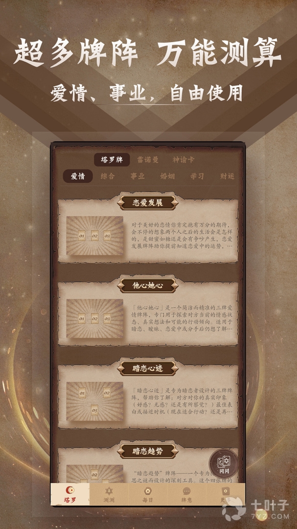 1、塔罗牌最新版为你带来了更为有趣好玩的塔罗牌占卜应用,非常火爆的一种占卜形式,让广大用户可以有效的进行测试,更为丰富的内容方式,让你可以更为愉快的进行使用参与
