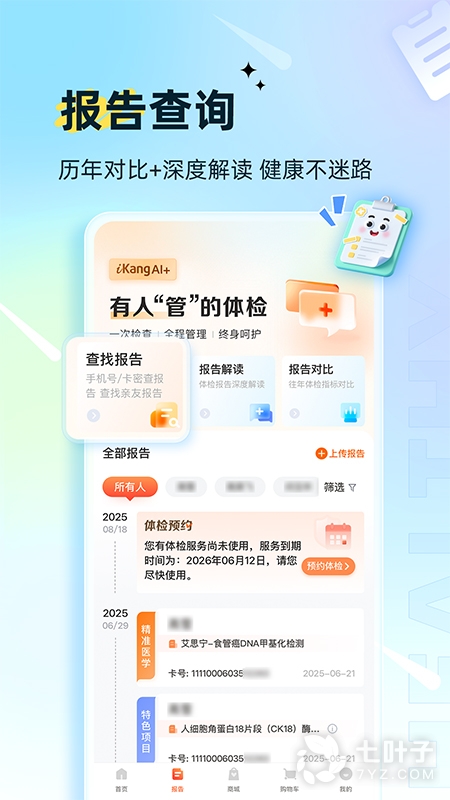体检报告—您可以登陆爱康网或爱康体检宝,输入爱康卡号及密码,进入“我的爱康”点击体检报告,进行“体检报告”查询下载。