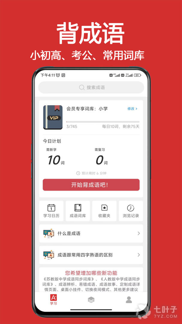 5、语文同步学-成语斩,可选择小学、中考、高考、生活常用词库,自由制定每日学习计划学新成语,复习已学成语,保持词汇量不断增长