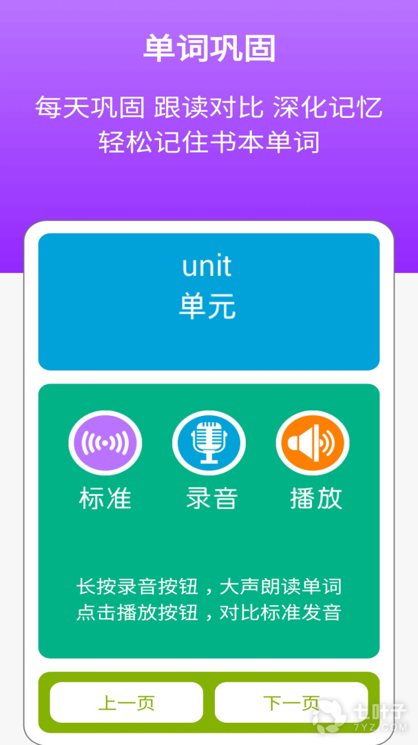 1、新目标英语七上App,为七年级学生打造的新目标英语电子课本,为学生带来了单词巩固、口语增强、同步点读等特点;每天巩固跟读对比深化记忆,轻松记住书本单词,可以操作标准、录音、播放等按钮,长按录音按钮,大声朗读单词,点击播放按钮,对比标准发音