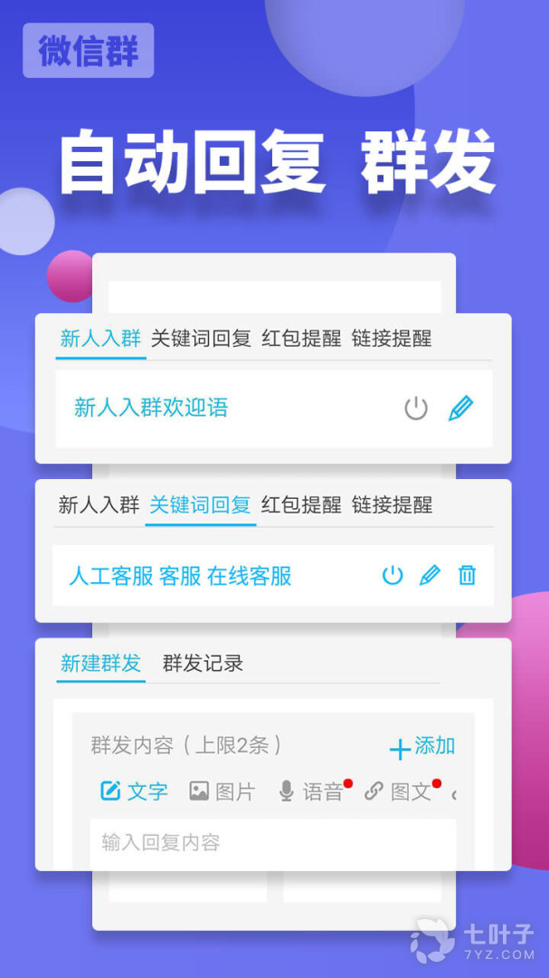 1、设置闹钟定时发消息,支持图文回复,全面解放时间