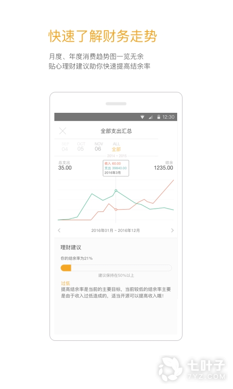 2.消费趋势:富有表现力的曲线图、饼状图和收支排行榜,帮你快速分析消费趋势;