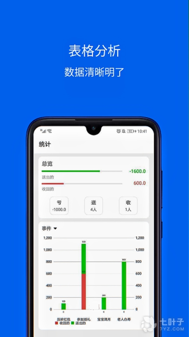 3.强大的图表分析功能,清晰明了的分析你的送出、收回的份子钱比例等;