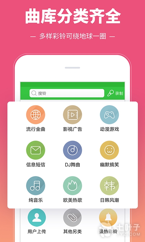 流行金曲,影视热曲,动漫游戏,短信闹铃,DJ舞曲,搞笑另类,网络神曲,网友上传等;