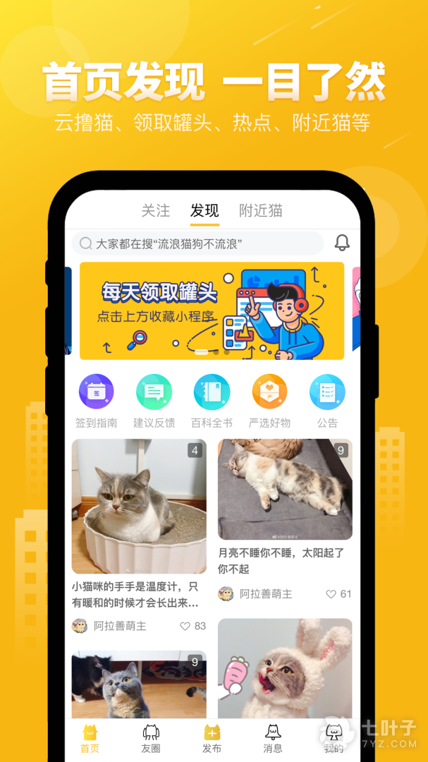1、友猫萌趣友爱的宠物社区分享平台,在这里一起展示主子们的美好世界,认识更多的宠友,同时还有流浪猫共享喂养功能,打开地图查看附近的猫猫,一起建立宠物救助组织等等,十分好用!下载友猫试一试吧