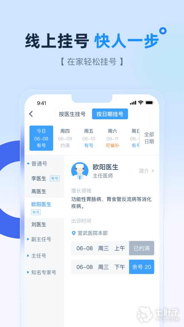 通过APP可预约7天内号源,每日15:00点自动投放出第8日新号源,每日2:00-23:30可挂号。
