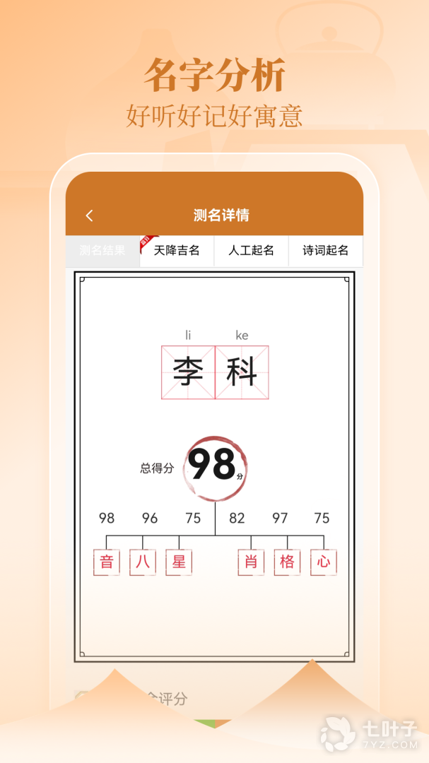 1、它从汉字的笔划、字形、字义、音韵、音调等方面进行筛选,带来最高分好名字