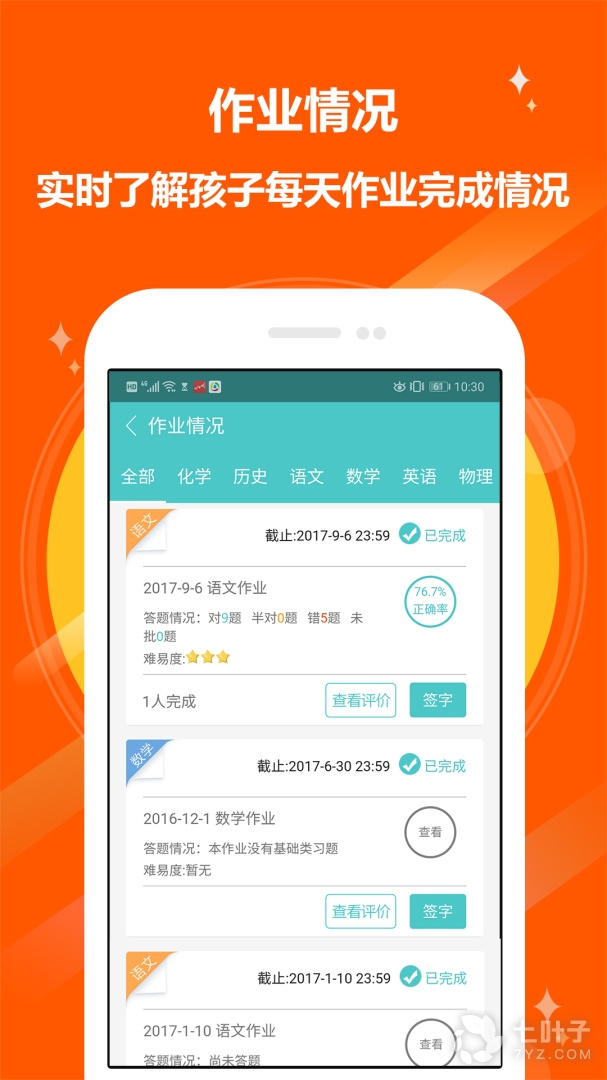 2、作业情况:了解孩子每天的作业完成情况,答题正确率情况,并且可以查看老师的批阅评价信息。