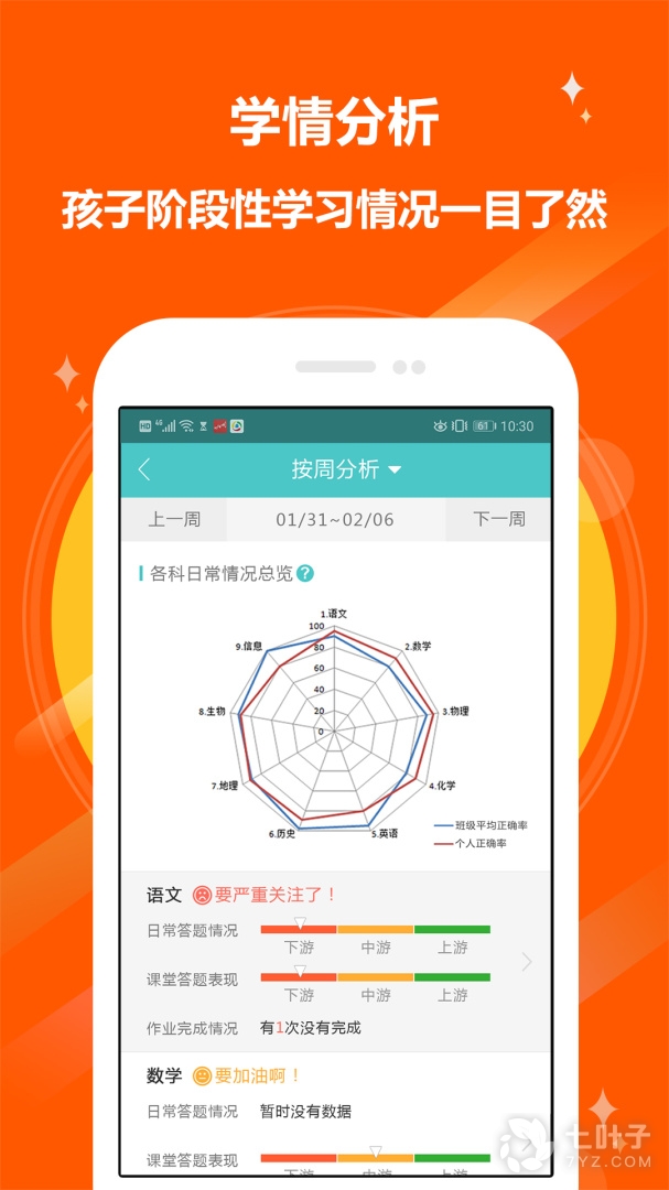 3、学情分析:通过每周六定时给家长推送孩子一周的学习情况分析报告,帮助家长及时了解孩子各个学科的学习情况,便于利用周末的时间进行补救。学情分析整体上多维度对孩子一周或一个学期的学习进行分析总结,让家长对孩子各科的学习趋势一目了然。